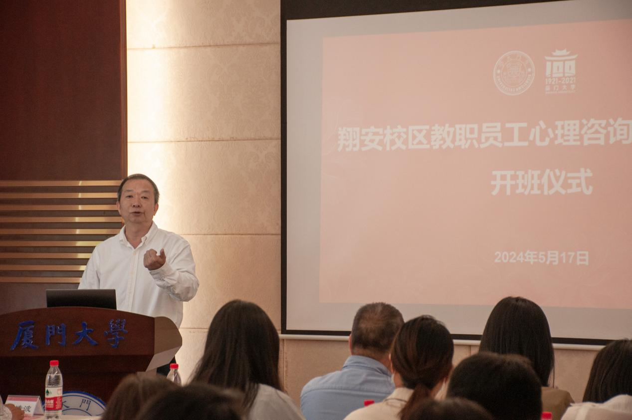 为贯彻落实《中共厦门大学委员会、厦门大学关于进一步加强和改进学生心理健康教育工作的实施意见》,加强翔安校区心理健康教育工作队伍建设,构建全员心育工作格局,推进健康校园建设,2024年5月17日,翔安校区教职员工心理咨询技能培训班在德旺图书馆D204开班。校长助理、翔安校区管委会主任陈光,原福建医科大学人文学院党委书记、副院长林大熙,厦门市心理咨询师协会副会长吴清波等出席活动。仪式由翔安校区学生办主任、学生工作部副部长高斌主持。