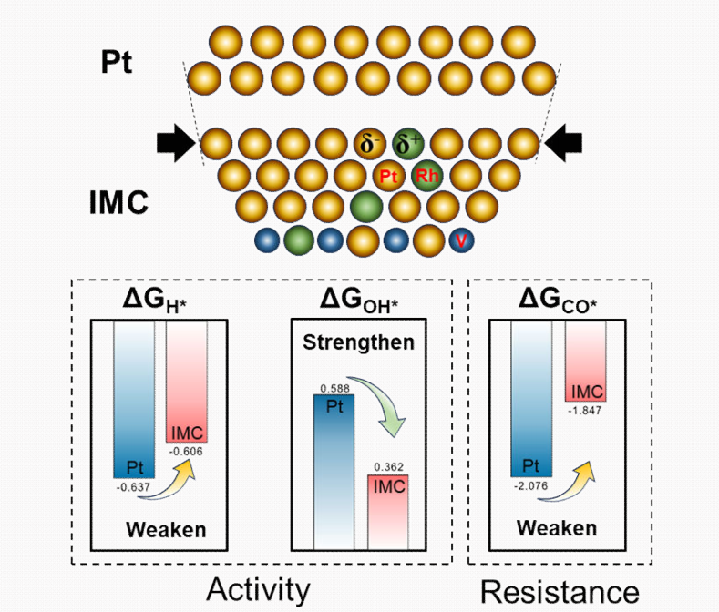 团队通过氧化物自限制生长策略,制备了具有晶格收缩Pt-Rh的超小三元L12-(Pt0.9Rh0.1)3V金属间纳米颗粒(约2.2 nm),以提高HOR性能。所制备的 (Pt0.9Rh0.1)3V在纯H2中的HOR质量/比活度比Pt/C提高了5.5/3.7倍,在1000 ppm CO/H2混合气中有效抑制了活性衰减。原位壳层隔绝纳米粒子增强拉曼光谱显示,压缩应变Pt具有卓越的抗CO*能力,双功能效应促进了含氧物种的吸附。在密度泛函理论DFT计算辅助下,由于晶格收缩,(Pt0.9Rh0.1)3V上H*和CO*的吸附能相较于Pt都有所降低,而OH*的吸附则因引入亲氧金属Rh而增强。该研究为通过优化不同中间产物的吸附来提高电催化性能提供了一种有效策略。