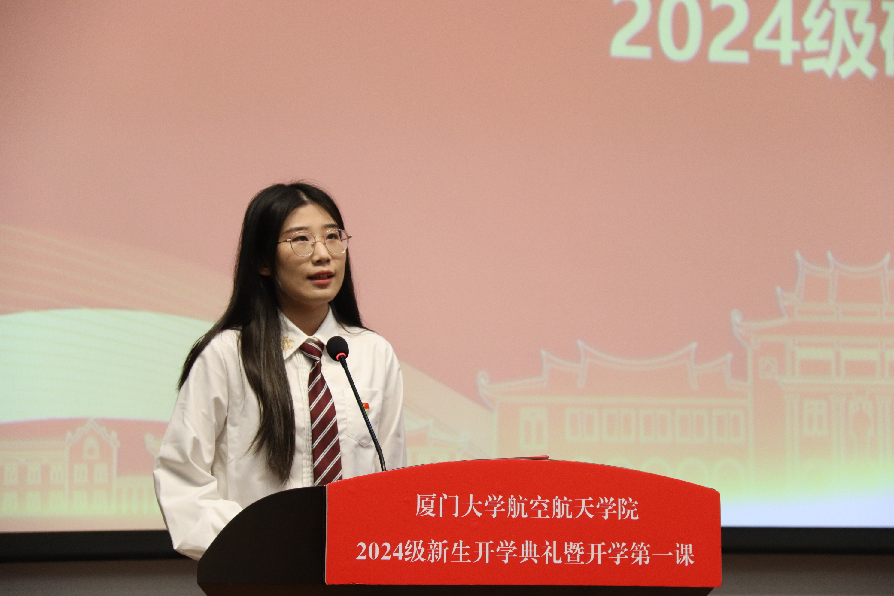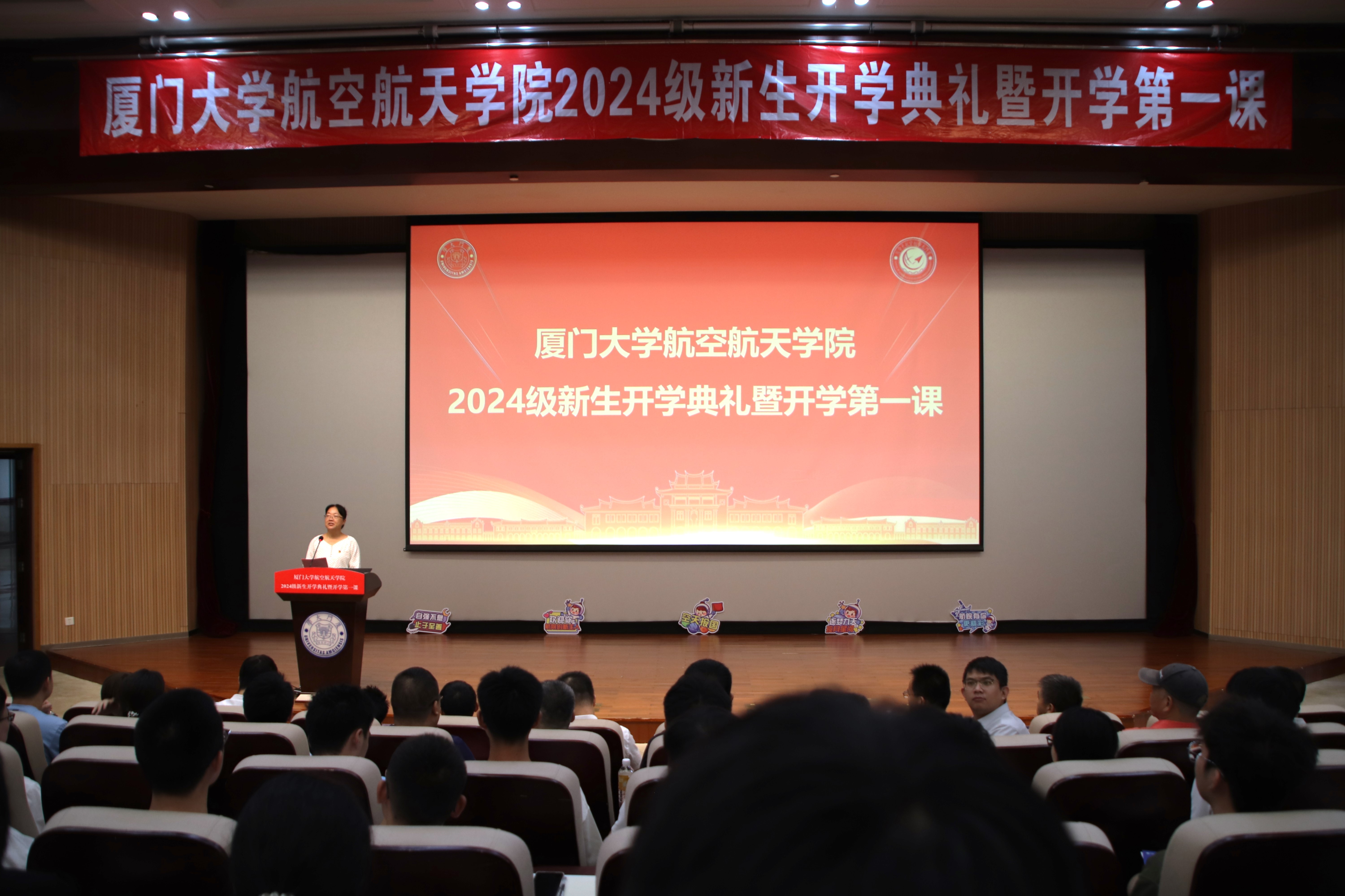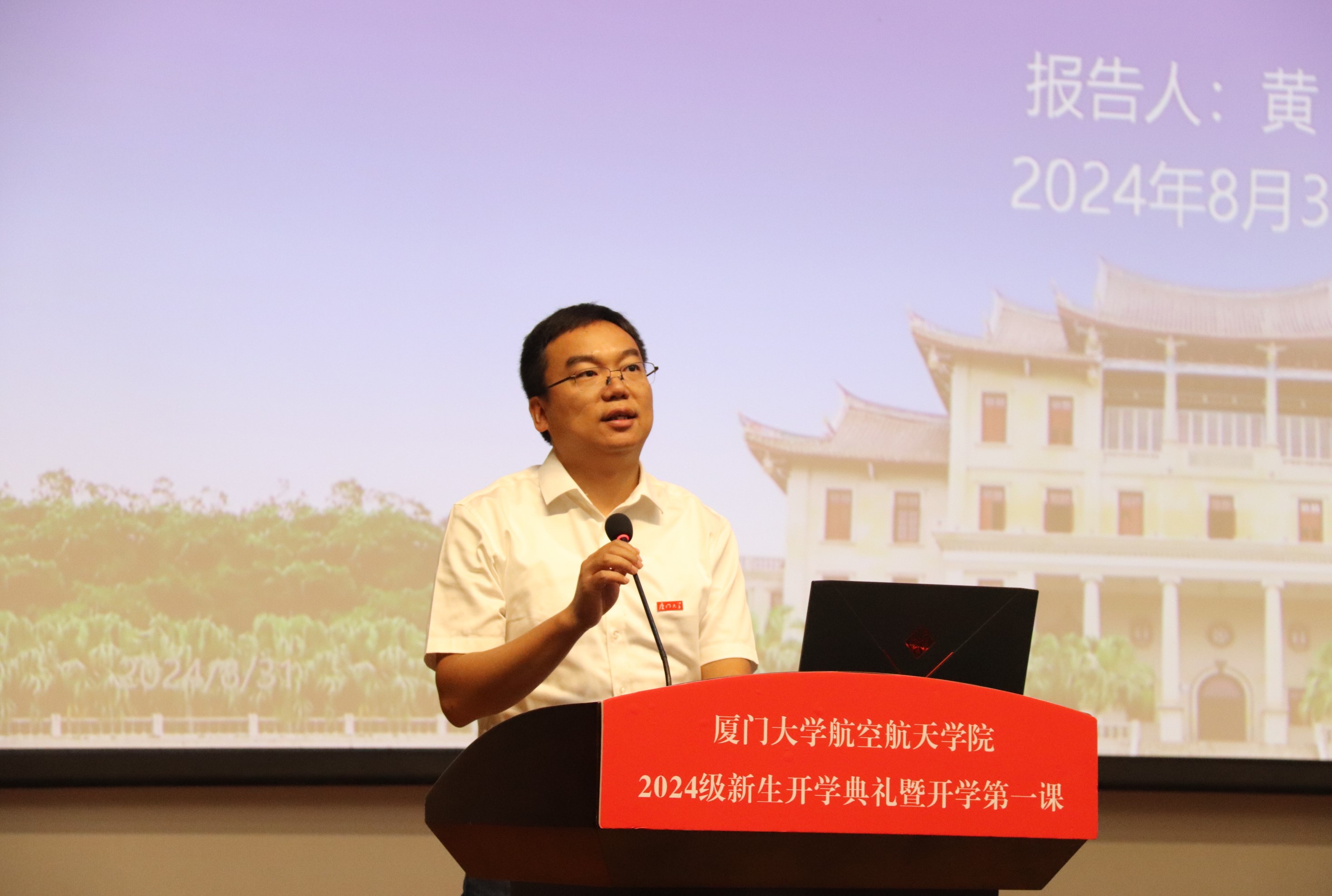 黄玥从组织架构、学科分布、平台条件、师资队伍、各中心发展、人才培养等方面向全体新生介绍学院概况,重点展示了学院代表性科研成果和各科研团队,激发新生学习科研热情。他指出,厦门大学航空教育历史悠久,学院紧跟国际前沿与国家战略,与航空航天各相关单位密切交流、深度合作。他鼓励新生充分利用校院提供的丰富学习资源,做好学涯规划,明确学习目标,共同为国家的空天事业努力奋斗。