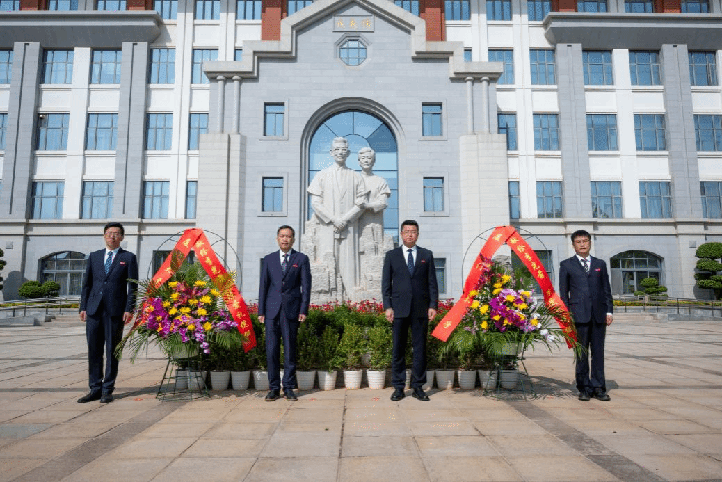 诗朗诵后,翔安校区管委会主任陈怀锋、医学院党委书记李峰、生命科学学院党委书记马进龙、柔性电子(未来技术)研究院党总支副书记(主持工作)蒲晓业向陈嘉庚先生铜像敬献花篮并整理缎带。
