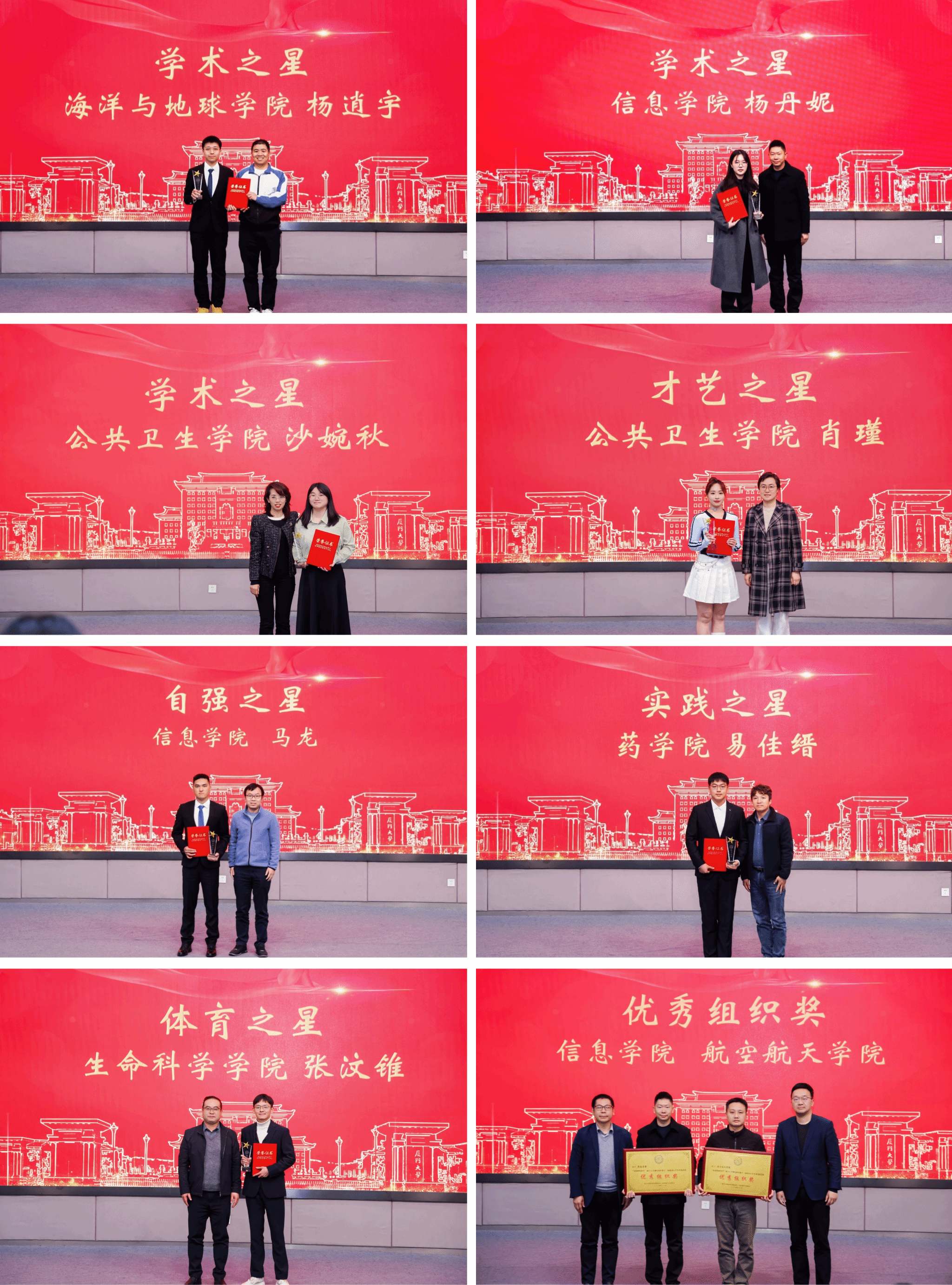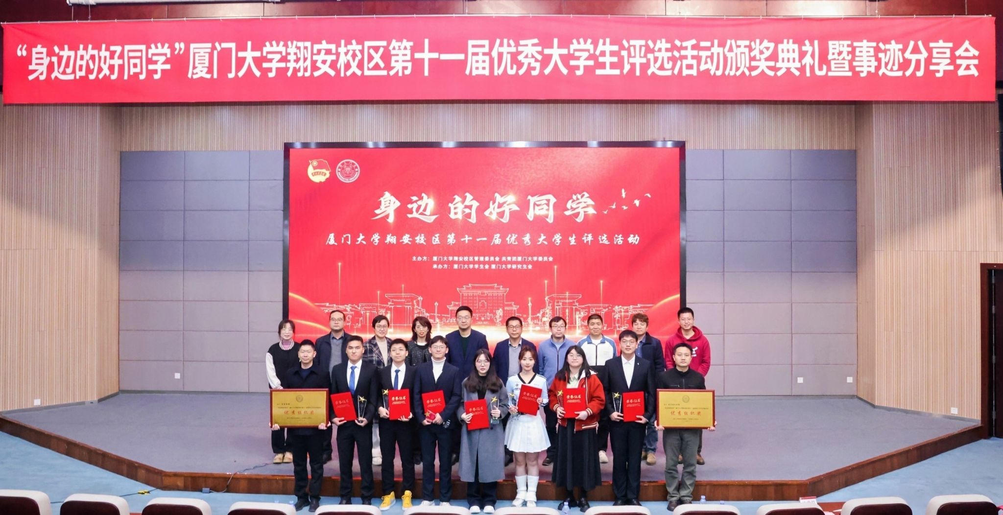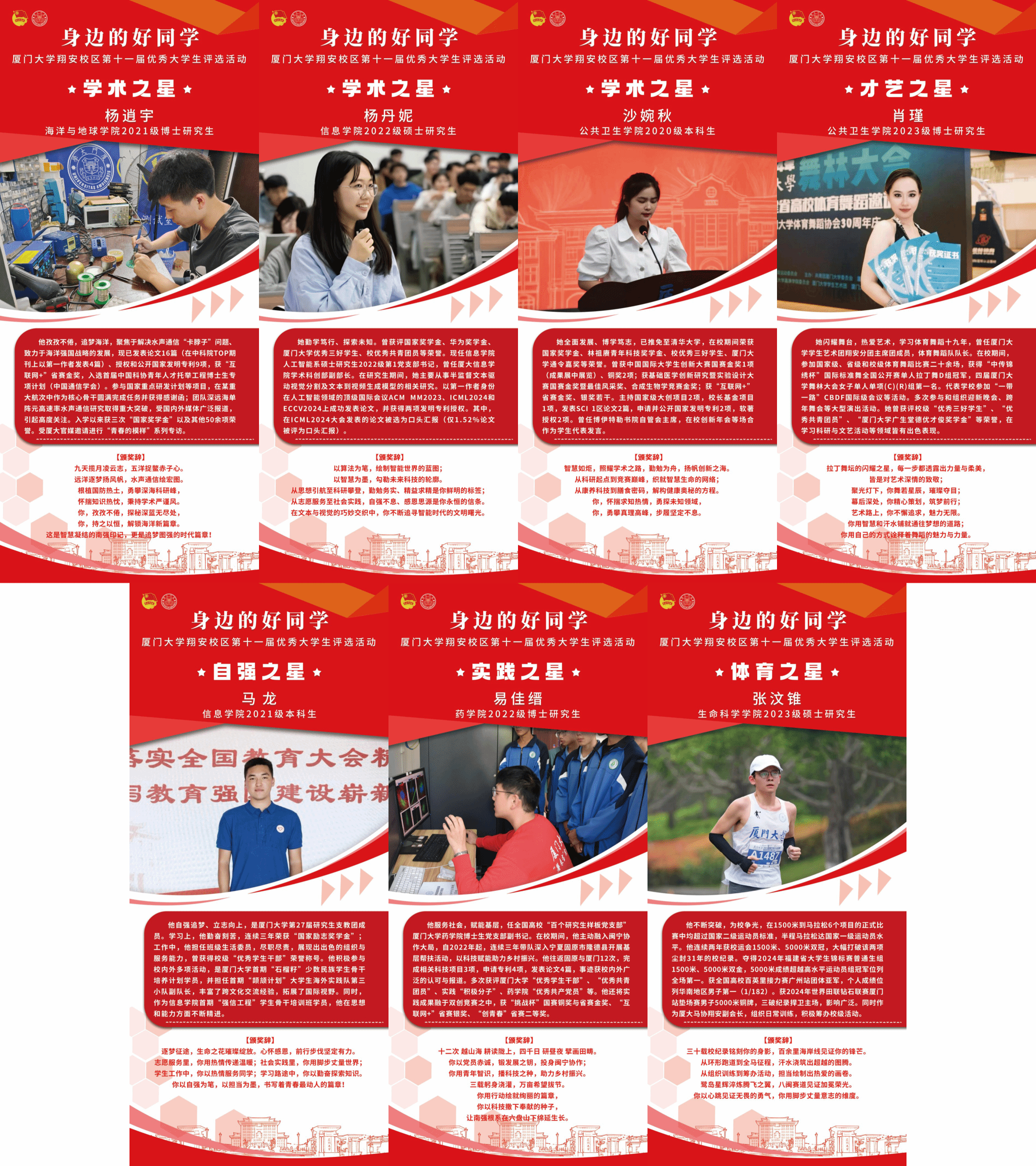 十一年栉风沐雨,十一年星光璀璨。“身边的好同学”厦门大学翔安校区优秀大学生评选活动,旨在发掘那些在翔安校区内积极进取、勤奋耕耘、无私奉献、坚韧不拔的优秀学生事迹,培养德智体美劳全面发展的社会主义建设者和接班人。每一位获奖者都以实际行动诠释了“自强不息,止于至善”的厦大精神。他们的故事如点点星光,汇聚成照亮校园的璀璨星河。他们的奋斗足迹,既是个人成长的缩影,也是校园精神传承的生动注脚。