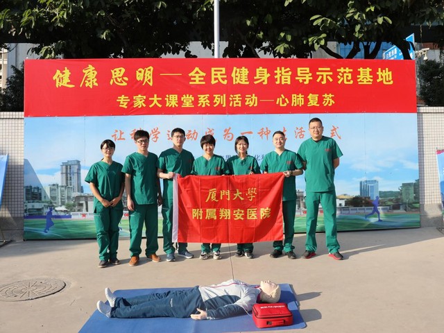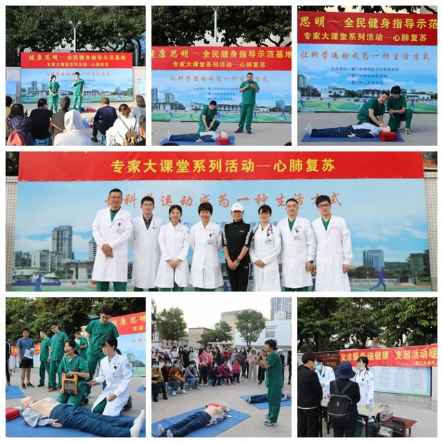 秋冬季节是心血管呼吸系统疾病的高发期,为增强广大市民面对危及生命健康紧急情况的应急处置能力,12月5日下午,厦门市思明区文化和旅游局携手厦门大学体育教学部党委、厦门大学附属翔安医院党委在“健康思明——全民健身指导示范基地”联合打造“专家大课堂”系列活动之心肺复苏。基地负责人、厦大体育教学部体操党支部书记赵秋爽老师、厦大翔安医院国家临床教学培训示范中心、机关第三支部党员张莉莉老师及来自各个党支部、临床科室的医务人员组织开展了一场别开生面的急救知识普及活动。活动开始前就接到了50余名市民的报名,活动现场更是人山人海,气氛热烈。