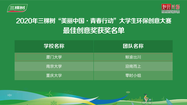 12月5日,三棵树“美丽中国·青春行动”大学生环保创意大赛奖项结果公布,我校参赛队“鲸渝出川”作品荣获最佳创意奖。同时,“鲸渝出川”和环境与生态学院学生参与的“林深见鹿实践队”作品双双获大赛校级优秀奖。