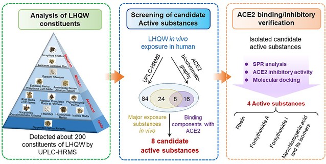 这项研究基于HRMS和智能非靶向数据挖掘技术,全面分析了对多次给药后人血浆和尿液中的连花清瘟胶囊成分,合成了全新的ACE2生物色谱固定相,筛选出连花清瘟胶囊提取物和人尿液样品潜在的ACE2靶向成分。最终,确定了8种暴露于人体且具有潜在ACE2靶向能力的连花清瘟成分,通过SPR、ACE2活性抑制和分子对接实验进一步进行药效学评价。发现大黄酸,连翘酯苷A,连翘酯苷I,新绿原酸及其异构体均对ACE2具有较高的抑制作用。这些化合物通过阻断新冠病毒S蛋白与ACE2结合以及结合在新冠病毒S蛋白-ACE2复合体表面抑制SARS-CoV-2的潜在作用,协同发挥防治COVID-19的作用。