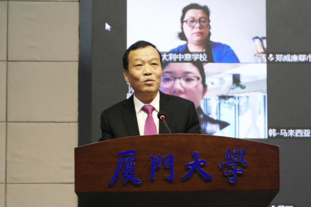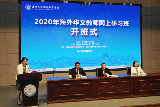 10月30日下午,由中华海外联谊会主办,福建省海外联谊会、厦门大学承办,厦门大学海外教育学院、福建省海外华文教育发展中心协办的2020年海外华文教师网上研习班在厦门大学翔安校区德旺图书馆二号报告厅顺利开班。福建省海外联谊会副会长郑惠文,厦门大学海外教育学院/国际学院院长陶涛,厦门大学党委统战部副部长秦红梅,福建省海外联谊会文化教育处处长游理忠,福建省海外华文教育发展中心主持工作副主任吴宗斌出席开班式。14个国家的584名学员在线参与此次培训。海外教育学院华文系(主持工作)副系主任潘超青主持开班式。