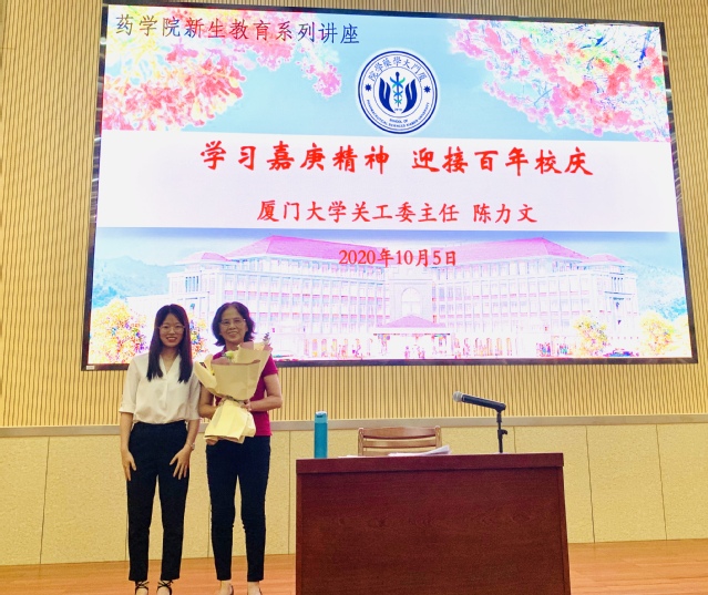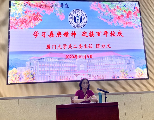 10月5日下午,受药学院党委邀请,厦门大学关工委主任、校党委原副书记陈力文专程来到翔安校区,为药学院2020级全体新生作“学习嘉庚精神,迎接百年校庆”专题讲座。讲座由药学院党委副书记杜超主持。
