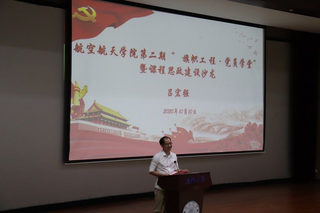 2020年10月10日上午,航空航天学院第二期“旗帜工程•党员学堂”暨课程思政建设沙龙在德旺图书馆一号报告厅举行,活动邀请到南京航空航天大学航空学院吕宏强教授作为主讲嘉宾。航空航天学院党委副书记张晴、林蔚,学院学生党员与课程思政教师代表、校区其他学院学生代表参加了本次活动,航空航天学院常务副院长尤延铖主持活动。