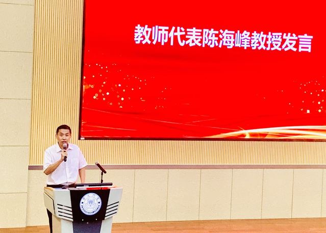 陈海峰教授代表教师发言。他从自身的求学和科研经历出发,结合新冠肺炎疫情防控的实际,为同学们介绍了生物医药作为朝阳行业的发展前景。他鼓励同学们努力学会在生活点滴中体会药学专业的魅力,培养药学专业学习的热情,丰富多学科知识储备,力争为国家医药卫生事业发展做出贡献。