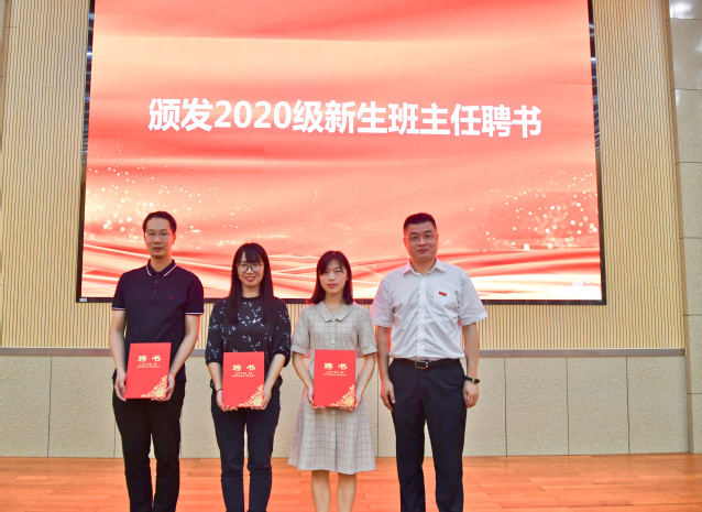 随后举行了新生班主任聘任仪式,陈怀锋为担任新生班主任的吴云龙、刘杰、夏琳三位老师颁发了聘书。三位班主任将发挥所长,帮助2020级学生更快适应大学生活、更好成长成材。
