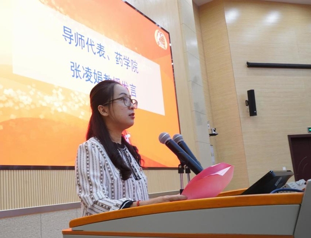 导师代表、药学院张凌娟教授发言。她以自己的留学归国经历说起,鼓励同学们努力学习,强大自己。接着她从学习规划、正视失败、学术诚信和品德修养四个方面为新生们提出了几点建议。最后她祝愿各位同学能尽快适应新环境,学业顺利,学有所成。