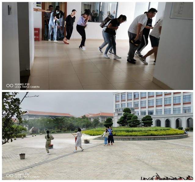 接下来,省应急管理讲师、厦门市消防救援支队、思明区消防救援大队培训讲师林乐坦,通过生动的案例及专业的知识,介绍了火灾安全知识、火场逃生技能、快速扑灭初期火灾、灭火器及消防栓的正常使用方法等。在学习了初步的理论基础后,接着开始了实操训练。现场模拟在实验室发现火情,师生弯腰低头、捂住口鼻,快速有序地疏散到庄瑾楼大厅。确认疏散人数无误后,林乐坦再次给大家讲解了灭火要点,然后分四列纵队进行灭火实操训练。有些同学灭火器的保险栓拔不出来,有些紧张得喷管还没拔出来就提着灭火器一下子冲到火盆旁,也有些离火盆靠得太近……经过一一演练指导,全场约100名师生员工都进行了灭火实操训练,不少同学还主动积极地进行了第二次操练。