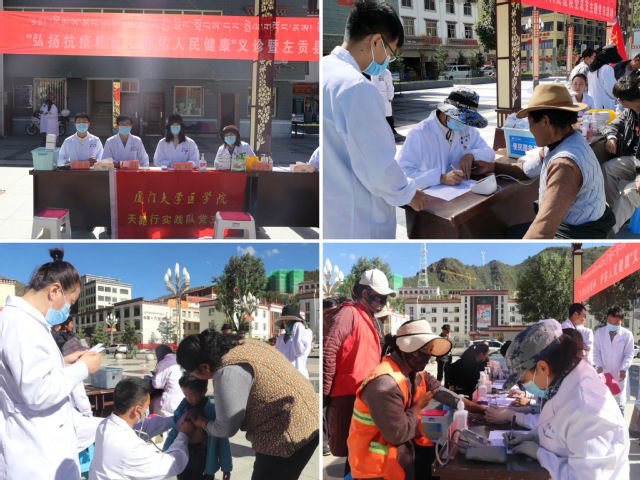 8月19日,实践队抵藏的第二天恰逢第三个中国医师节来临,实践队克服高原反应,与西藏左贡县人民医院、左贡县卫健委一同在左贡县红旗广场举行主题为“弘扬抗疫精神,保佑人民健康”的义诊活动,以特殊方式庆祝医师节。义诊主要有测量血压、内科、外科、妇产科、检测血型、发放常用药品等内容。活动现场医务人员对来咨询就诊的百姓进行了耐心细致的解答,对有疾病的患者现场进行了基本检查,对身体查出问题的,提出了进一步检查和治疗的建议,并耐心细致的叮嘱日常生活中所应该注意的事项。此次义诊共有包括左贡县人民医院党支部书记李健、医院副院长万荣在内的20余名医护人员参加,有200余名当地百姓慕名而来,免费发放药物50多余盒,还为100余名群众测量血压,受到左贡县人民群众的广泛好评。