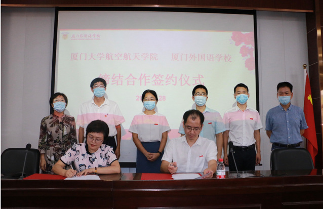7月28日,厦门大学航空航天学院与厦门外国语学校签订合作协议,签约仪式在厦门外国语学校海沧校区举行。航空航天学院常务副院长尤延铖、党委副书记林蔚、副教授吴了泥、高级工程师胡天林,厦门外国语学校党委书记/校长谢慧、党委副书记叶穗灿、副校长李勇、副校长郑远鹏等参加签约仪式,尤延铖和谢慧代表双方签署协议。
