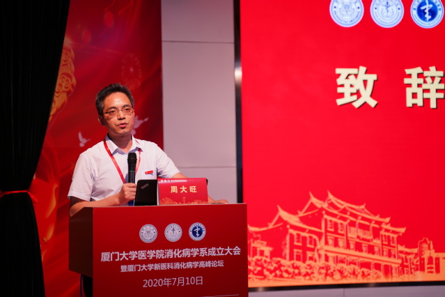 周大旺副校长在讲话中指出,学校非常重视医科建设,明确将医科作为学科发展新增长点,不断加大对医学院及附属医院的投入,支持临床医学发展。为适应“新医科”建设需要,学校于今年4月批准医学部率先启动“一部一策”的改革,支持学部自主设立临床科系。消化病学系的成立,将大学本部的优势资源和附属医院的临床资源进行有效的整合,有利于“双一流”学科建设,也有利于提升消化病学科的品牌影响力,标志着厦门大学新医科发展战略迈出了重要的一步。