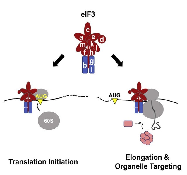 图为eIF3在翻译起始、延伸和新生蛋白靶向过程中的作用模型