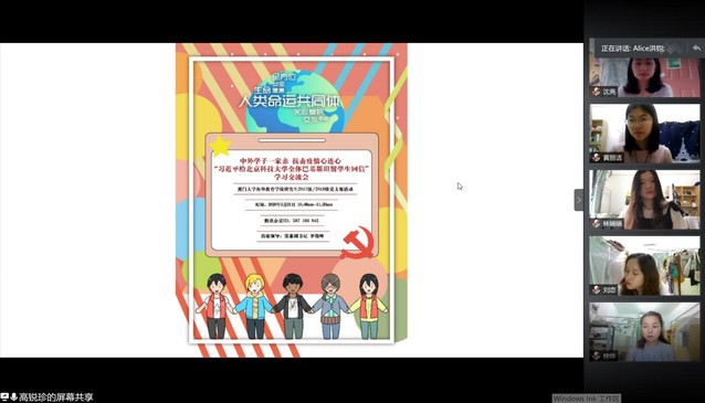 5月17日,国家主席习近平给北京科技大学全体巴基斯坦留学生回信,对各国优秀青年来华学习深造表示欢迎,鼓励他们多同中国青年交流,同世界各国青年一道,携手为促进民心相通、推动构建人类命运共同体贡献力量。21日上午,厦门大学海外教育学院研究生2017级、2018级党支部举办“习近平给北京科技大学全体巴基斯坦留学生回信”学习交流会。海内外学子共读习近平总书记回信,分享疫情期间中外学子风雨同舟、命运与共的点滴故事和心得感想。