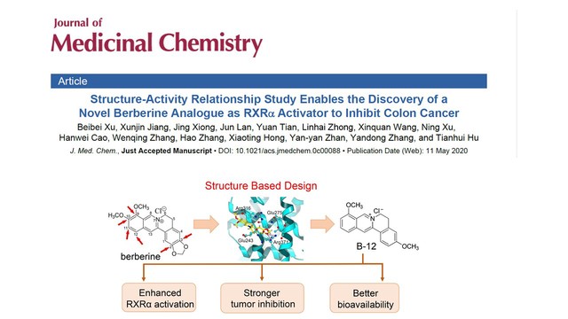 胡天惠教授研究团队长期从事黄连素抗肠癌机制的研究,并首次发现视黄醇X受体a(RXRa)是黄连素的细胞内靶点(Oncogene 2017, 36: 6906-6918)。而张延东教授团队近些年在活性天然产物全合成领域取得一系列重要进展(https://zhanglab.xmu.edu.cn/publications/)。在上述研究基础上,胡天惠团队与张延东团队紧密合作、优势互补,针对黄连素与RXRa的结合模式,运用结构生物学方法和全合成相结合,设计合成了多种黄连素衍生物,并开展了构效关系分析。发现黄连素衍生物B-12在结合并激活RXRa、抗肠癌活性、溶解度和生物利用度方面均明显优于黄连素,且保留了黄连素的肿瘤选择性和低毒副作用,具有很好的临床转化前景。