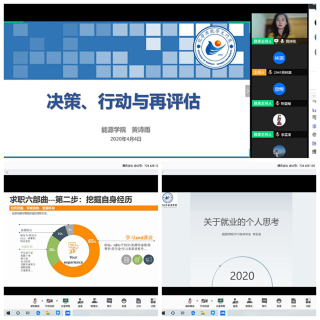 今年的春天是特别的,疫情或许阻挡了我们返校的脚步,但挡不住经验的分享与感悟的交流。为帮助同学们在疫情期间做好升学、就业的准备,能源学院于4月3日及4日晚成功举办了“能源学院2020年升学就业经验分享交流分享会”,2015级本科生李乐恒、2016级本科生熊贝妮、田扣扣、陈燕地、谢世俊、何逸盈、2017级研究生李孟渚和国家职业指导师黄诗雨老师出席了本次分享会并为同学们做了经验分享。8位嘉宾通过精心准备分享、有的放矢地介绍升学与就业路上地经验感悟,不仅为同学们带来了干货十足的分享,还一一解答了同学们的疑问。分享会结束后,同学们均表示收获满满、受益匪浅。