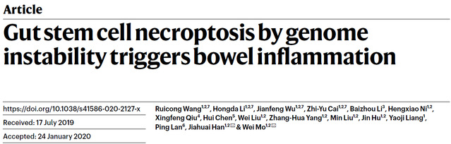 2020年3月25日,细胞应激生物学国家重点实验室,厦门大学生命科学学院莫玮教授课题组和韩家淮院士课题组合作在Nature杂志上发表题为“Gut stem cell necroptosis by genome instability triggers bowel inflammation”的研究文章,报道了肠道干细胞中基因组不稳定激活ZBP1-RIP3-MLKL轴引发干细胞坏死,导致自发性的肠道炎症。