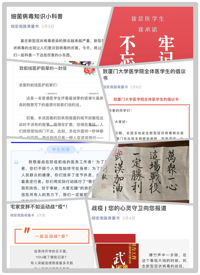 面对疫情,30名本研医学生第一时间组建健康教育小分队,他们时刻关注疫情动态,利用微信公众平台“翔安南路青囊书”、微信群、QQ群等媒体平台,发布系列科普文章,提高广大学生对新冠肺炎的认知水平,引导大家科学应对防范;发布《疫情当前,我是医学生,我承诺》、《致厦门大学医学院全体医学生的倡议书》等,号召医学生不忘学医初心,随时做好应召抗击疫情准备;一封封来自医学生个人和班级团支部的信,用图画、文字、音乐送去最衷心的祝福,声援正在一线抗疫的广大医务工作者;策划一系列暖心行动,利用网络开展心理辅导,引导广大学生理性面对疫情,呼吁大家读好书,提高专业知识,勤运动,锤炼健康体魄。