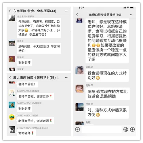 附属东南医院妇产科学教师陈慧主任课后表示她更喜欢线上教学的上课方式,可以将主动性更多地给学生,学习过程也变得更加轻松和有趣,学生对于知识点的掌握也比填鸭式的教学方式更加牢固。2017级临床医学专业学生黄旭安说:“在钉钉平台上,老师的授课生动有趣,使我受益良多,在当下这种特殊时期,我们虽然无法正常开学,但我们停课不停学,一定会圆满完成这学期的学习任务的。”