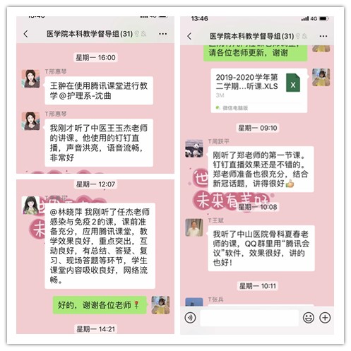 附属医院的临床老师虽然驰援在疫情防控的一线,但是教学的热情却丝毫未减。他们利用晚上甚至半夜学习软件,提前模拟测试,为线上讲课做着各种准备。附属中山医院陈兰、张孝斌,附属翔安医院陈先礼等临床老师支援在武汉一线,仍然参与课程筹备工作或坚持自己在线直播给学生讲课。临床教师们一边战“疫”,一边教学,他们这种践行使命,勇于担当的时代精神在教与学中激励感染着每一个医学生奋发图强,砥砺前行。