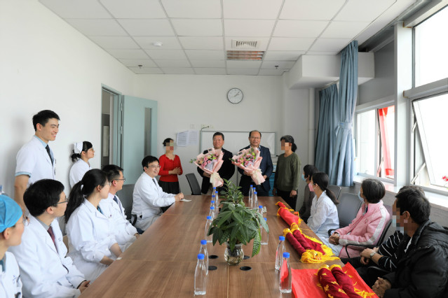 经过医护团队近1个月的不懈努力,首批两位肾移植患者即将康复出院,为庆祝这意义非凡的时刻, 1月7日,厦大翔安医院泌尿外科首批肾移植患者答谢会在住院部8楼泌尿外科医生办公室隆重举行。会上,附属翔安医院党委书记吴立武、执行院长张国君教授,泌尿外科主任、肾移植负责人邵晨教授分别感谢并表扬了肾移植团队及相关科室部门在移植筹备及建设中密切配合,高效安全的作风及无惧艰辛、勇往直前的精神,并祝福首批肾移植患者顺利出院、新春快乐、生活美满,早日回归社会。同时,患者代表汪先生及患者家属代表许女士分别对肾移植相关科室部门领导、工作人员致以崇高的敬意和衷心的感谢,感谢医护团队如家人般无微不至的照料。患者及家属向吴书记、张院长献花以表感激之情,向肾移植相关工作人员送上锦旗并合影留念。