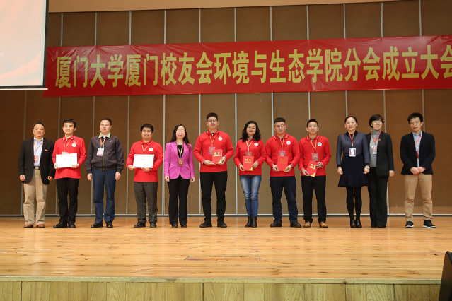 2009 级院友陆成凯代表分会筹备组汇报筹备情况,随后会议审议通过分会章程。环境与生态学院党委副书记毛通双宣读并提请大会表决通过了分会理事会理事人选、监事会监事人选、常务理事、会长、常务副会长、副会长、秘书长、副秘书长人选名单。2001级本科生院友游明华任会长、2009级本科生院友陆成凯任秘书长。游明华宣读分会名誉会长名单,敦聘环境与生态学院洪华生、袁东星、卢昌义、张珞平、陈小麟5位老师任分会名誉会长。