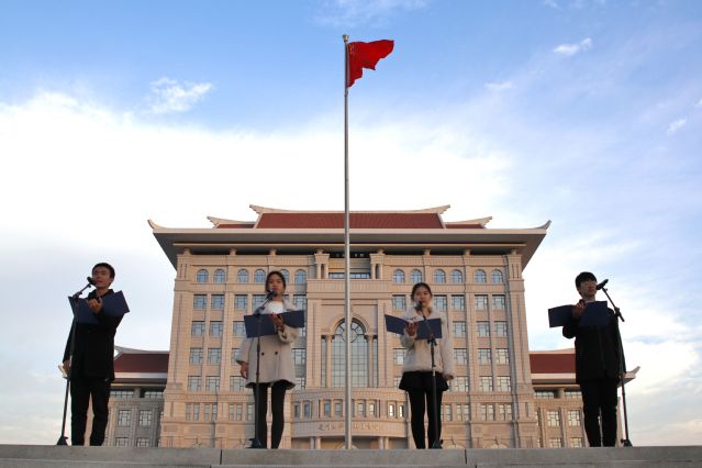 礼毕,艺术团学生代表进行“峥嵘一二九 扬帆再起航”纪念“一二·九”运动诗歌朗诵。他们以饱满的激情,抒发着对青年前辈们爱国豪情和大无畏勇气的讴歌与赞颂。他们以满腔的热血,书写着我们当代青年将怀揣先辈的嘱托,用火热的青春去锻造:中国精神,中国自信,中国力量!