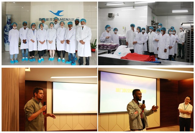 参访的下一站,大家来到了厦航的配餐部,当摆盘精美的食物端到大家面前时,每一个同学都对美味的餐食赞不绝口。在听取了工作人员对厦航空中美食的介绍后,10名来自不同国家的同学进入配餐车间,与美食的生产制作来了一次“亲密接触”。