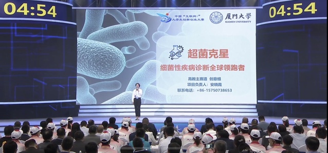 10月13-15日,第五届中国“互联网+”大学生创新创业大赛在浙江大学举办。生命科学学院李庆阁教授指导,2019届硕士毕业生安晓霞担任主创的项目“超菌克星——细菌性疾病诊断全球领跑者”参加大赛高教主赛道,队伍表现出色,获大赛金奖。“超菌克星”团队在13日的比赛中以小组第二89.86的高分夺得本次大赛厦大首金,顺利跻身全国前三十强,并成为唯一代表厦大参加三强争夺赛的队伍。在14日举行的三强争夺赛上,团队发挥优异,取得758分的优异成绩,圆满完成路演。