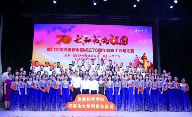 9月28日至29日晚,厦门大学庆祝中华人民共和国成立70周年教职工合唱比赛在建南大会堂举行,生命科学学院合唱队作为37支参赛教职工队伍之一,用歌声唱响了对祖国的爱与祝福。一首激昂顿挫的《在太行山上》,犹如千山万壑中喷薄而出的红日照遍了天空一样,给观众带来了强烈的听觉和想象力上的冲击。紧接其次的《我和我的祖国》,则深情款款地述说了对祖国的热爱与依恋。队员们都发挥出最好的状态,近乎完美的演唱获得了台下观众热烈的掌声,最终以96.14分的佳绩位列全校第7名,喜获二等奖!