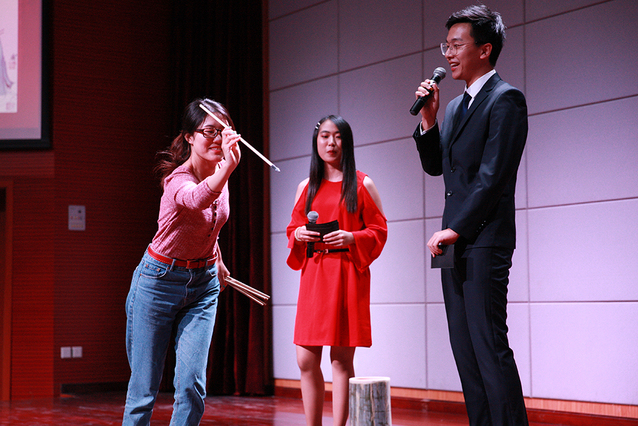 “暇日宾月集,投壶雅俗同”,投壶是从先秦延续至清末的中国传统礼仪和宴饮游戏,来源于射礼,以乐嘉宾,以习礼仪。为了让中外学生能更好感受这一古时风尚,主持人邀请六个自愿报名参加体验的同学先后上台,一展身手,他们或探出身,或半蹲,或捏紧箭杆,或站远使劲,台下的师生也一起给他们鼓掌加油,舞台上下气氛热烈,闪烁的现代舞美灯光下观众们体验的是古时宴会的风韵清雅,顿时有种时空交错的神奇感受。