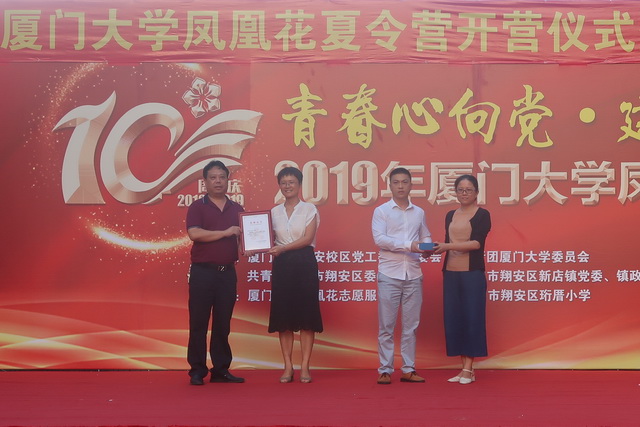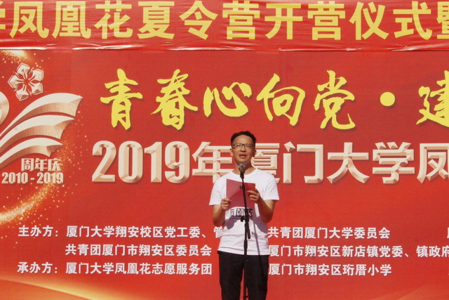 仪式上,厦门市翔安区新店镇党委副书记李峰泽宣布2019年凤凰花夏令营正式开营。翔安区教育局局长林佳跃和厦门大学翔安校区党工委副书记、管委会副主任黄宇霞共同为凤凰花服务志愿团志愿者授予志愿团团旗。厦门大学翔安校区学生办主任张清榕和厦门大学翔安校区办主任崔庆炜共同为凤凰花服务志愿团志愿者授予凤凰花社社旗。