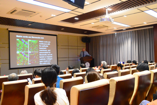 Andrew J. Quantock教授的演讲题目是《Cell-independent extracellular matrix configuration in early corneal development》。角膜基质是一个非常有序的胶原板层叠加阵列,该胶原阵列的排列方式维持了角膜的高度透明性。然而,这种独特结构的沉积机制仍未完全清楚。Quantock教授团队创新性地使用连续块面扫描电镜联合聚焦离子束扫描电镜的方法,对胚胎期小鸡角膜进行3D重建,观察到了早期角膜基质的发育过程和形成顺序。他们发现,胚胎角膜丝状伪足可能代表某些具有独特尺寸以及特异性功能的细胞结构,其在胶原纤维转化为板层结构的过程中起着关键作用,并且对这些结构提出新的术语“keratopodia”。