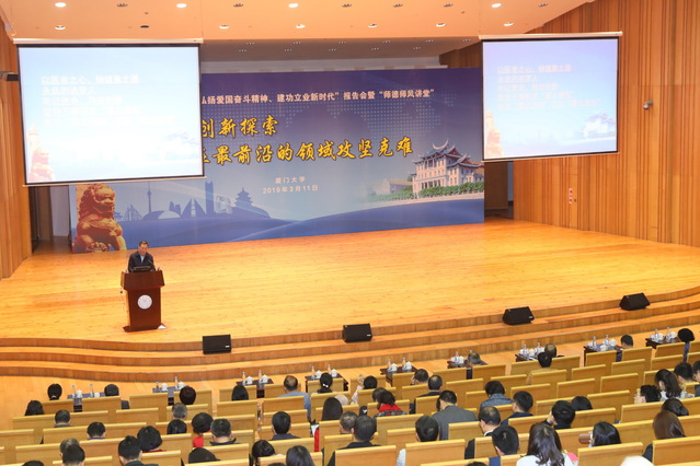为深入学习贯彻全国教育大会精神,落实立德树人根本任务,深入开展“弘扬爱国奋斗精神、建功立业新时代”活动和“培养社会主义建设者和接班人”主题学习教育,3月11日下午,“弘扬爱国奋斗精神、建功立业新时代”第三场报告会暨师德师风讲堂第四讲在科学艺术中心音乐厅举行。此次报告会以“勇于创新探索,在最前沿的领域攻坚克难”为主题。全国劳动模范、公共卫生学院院长夏宁邵教授,首批全国高校黄大年式教师团队成员、生命科学学院吴乔教授,福建省优秀共产党员、化学化工学院赵金保教授,厦门大学宏观经济研究中心、经济学院龚敏教授应邀作报告。校领导、校党委常委、校长助理出席报告会,校党委副书记、副校长李建发主持。