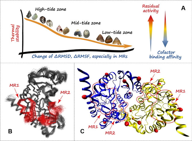 基于上述基础,课题组进一步拓展研究的深度与广度,比较分析了从南极洲半致死温度仅为 4 °C 的扇贝,到中国沿海可耐受 60 °C 以上高温的滨螺等26种海洋软体动物 cMDH 的温度耐受性,提出了蛋白质不同区域氨基酸的温度适应性变化模式,通过分子动力学分析揭示了具有重要功能的区域及其作用机制。这一系列研究成果加深了对海洋生物蛋白质温度适应机制的认识,为该领域提供了新的研究模式与思路,对于查明环境温度对生物分布的影响及其机制,预测气候变暖的生态学效应具有重要意义。