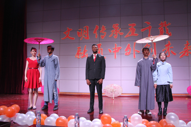 下午四时,文化互动体验活动开始,设在户外的体验区逐渐热闹了起来。不管是凝结着中国人平安祈福的中国传统工艺、行云流水的中国传统书画、其乐无穷的中国传统游戏,还是余音绕梁的中国传统乐器、不染纤尘的中国传统服饰,每个体验区的互动活动,都让现场的中外同学切身实地的感受中华文化的独特魅力。在本次“中国日”文化节中身兼数职,既担任主持人又是演职人员的尼日利亚籍研究生孙浩天同学感慨颇多,“今年中国日所有的活动都包含着中外文化交流的魅力与特征,是一次丰富的教学实践!”