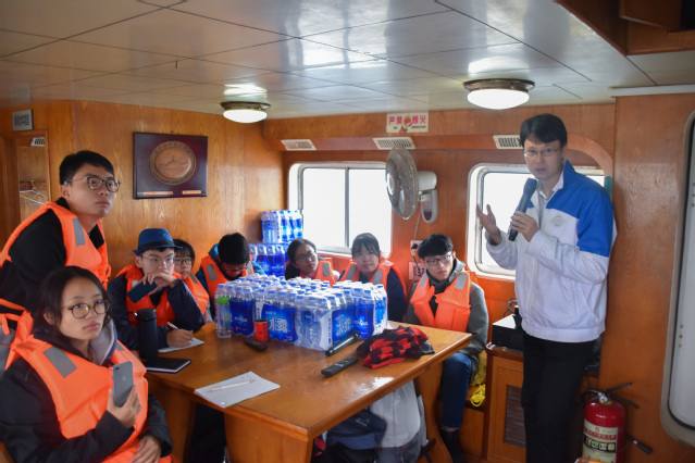 9日上午,六支决赛队伍登上“海洋二号”科考船。通过老师授课、与船员深入交流,近距离了解海洋人的工作和生活。学院老师为同学们介绍了“海洋二号”的基本情况,讲授了进行海上科研作业的注意事项,讲解了海洋科考中的水文要素测量、生物调查、海洋监测等相关知识,选手们认真听讲并做记录,收获良多。