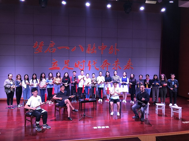 为了让同学们更深入地了解南音的表演形式,吴宝雅老师还带来了诸多南音伴奏乐器,包括“上四管”——琵琶、二弦、洞箫、三弦、“下四弦”——双灵、四宝、响盏、小叫。她对这些南音伴奏乐器一一进行了介绍,并邀请在场同学们上台体验,学习不同乐器的演奏技巧。在场的中外同学们兴趣盎然,台上台下互动频繁,其中来自塔吉克斯坦的李小龙同学更是被优雅别致的琵琶深深吸引,抱着它久久不愿放下。最后现场组成了一只富有国际色彩“临时南乐团”,吴老师就在这只临时乐队的伴奏下,为同学们展示了一段精美绝伦南音唱腔。讲座中,吴老师软声细语,讲唱结合,让在场听众感受到一丝来自闽地的温和与亲切,她独到的讲解和优雅的示范,也让更多第一次接触南音的同学们,对南音留下了美好的印象。