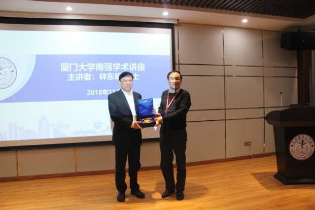 11月30日上午,厦门大学第911期南强学术讲座在医学院成义楼一楼学术报告厅举行。中国医学科学院肿瘤医院林东昕院士应邀为我校师生做题为《piRNA与结直肠癌的研究》的学术报告。讲座开始前,厦门大学副校长、医学院院长韩家淮院士为林东昕院士颁授南强讲座纪念牌。
