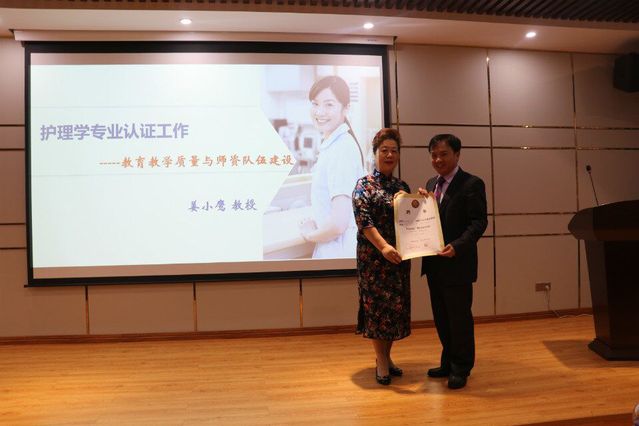 聘任仪式后,姜小鹰教授做了题为《护理学专业认证工作——教育教学质量与师资队伍建设》的讲座。姜教授首先介绍了护理本科专业认证的标准与要求,包括宗旨及目标、教育计划、学生成绩评定、学生、教师、教育资源、教育评价、科学研究、管理行政和改革与发展等十个方面。姜教授指出,毕业生应达到的基本要求包含了思想道德与职业态度目标、知识目标和技能目标三个方面,并从以上几个方面分析当前护理学专业教育教学质量与师资队伍建设普遍存在的主要问题。最后,姜教授以“学科发展,人才是关键;教育提升,师资是关键”结束了精彩的讲座。