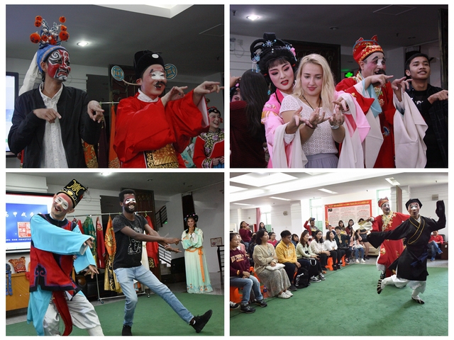此外,演员们还邀请在座学生上台学习经典舞台动作。在互动表演中,埃塞俄比亚留学生勇于上台挑战丑角装扮,有模有样地晃手臂、摆身段,将丑角的精髓表演得别具风味;国内汉硕女生们以娉婷之姿将“开门”这一花旦动作表演得淋漓尽致,全场掌声连连;孟加拉国留学生徐谦则一副花脸装扮,反行当挑战“布袋戏”丑角,现场观众们笑声不断。