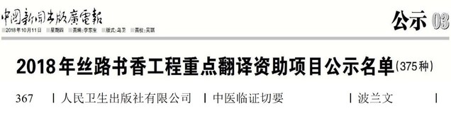 10月11日,国家广播电视总局丝路书香工程重点翻译资助项目办公室发布通知,医学院奚胜艳副教授、钱林超教授主编、王彦晖教授主审的《Essentials for Clinical Practice with Traditional Chinese Medicine(中医临证切要)》英文专著(人民卫生出版社出版,ISBN 978-7-117-20276-3/R•20277),其波兰文版入选2018年丝路书香工程重点翻译资助项目。