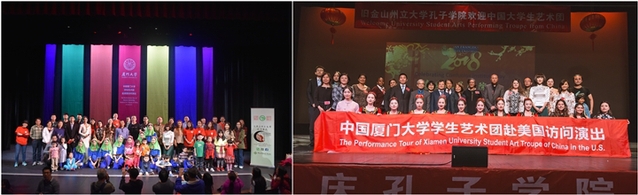 为支持各国孔子学院文化活动,充分发挥孔子学院综合文化交流平台的独特优势,使外国民众更加了解中华文化,受孔子学院总部委托,我校孔子学院办公室精心组织学生艺术团于9月18日至9月30日赴美国加州长滩州立大学孔子学院、圣地亚哥州立大学孔子学院、波特兰州立大学孔子学院、俄勒冈大学孔子学院、圣玛丽中学孔子课堂、犹他大学孔子学院、旧金山州立大学孔子学院开展文艺巡演活动,并为我校美洲校友献上校友专场演出。正值我校党委书记张彦率团访问美国,出席我校美洲校友会2018双年会活动,演出团受到张彦书记的亲切会见。