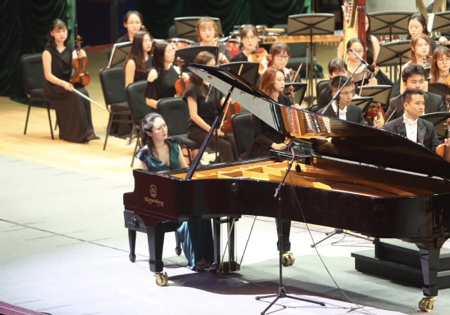 在优美的管弦乐声中,音乐会正式拉开序幕。一曲《欢欣的日子》很快将观众引入情境,欢快的旋律恰如今晚美丽的夜色与师生们愉快的心情,让人感受到幸福生活的喜悦。随后,二胡与管弦乐队的《引子吟腔与快板》作品通过交响乐队与二胡独奏相互交汇、对比的“交响化”处理,将鲜明的地方特色与浓烈的时代气息有机地融成了一体。紧接着,钢琴协奏曲《黄河》运用了西洋古典钢琴协奏曲的表现手法,为观众呈现了波澜壮阔、气势宏伟的音乐篇章,歌颂了中华民族前赴后继英勇不屈的献身精神,慷慨激昂的乐曲让人深受感染,曲中体现的中华民族不屈不挠的斗争精神也让听众不禁为之动容。最后,《第四交响曲——自强》(题献给伟大先贤陈嘉庚)用行板、很快的快板、中板、庄重的行板四个乐章生动的再现了陈嘉庚先生教育救国的办学历程,诉说着厦门大学近百年来走过的光辉岁月和为中华民族复兴做出的伟大功绩,表现出“南方之强”的独特魅力,是一曲对伟大的先贤们追求“至善”精神和境界的衷心赞美,深沉的旋律由交响乐团做出二十三款变奏,意味着民族奋斗道路的曲折、艰难,光荣与辉煌的光明前景。