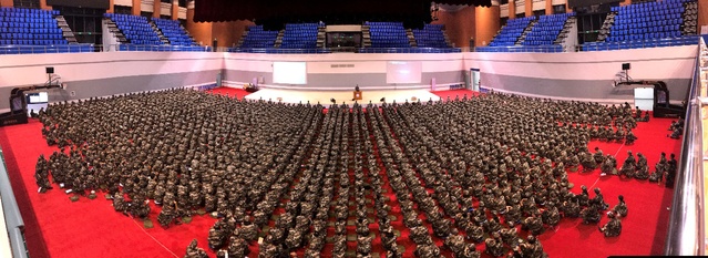 首先,刘红涛副团长为同学们带来了《强化国防观念,争做国之栋梁》的专题讲座。他从法之所定、成长所需、形势所迫三个方面,向新生诠释了军训的意义;并从历史渊源、军队改革等方面深入介绍了人民军队的情况。他以朱日和对抗演习实例,强调国防建设的重要性。他呼吁广大新生,当不浪费大学时光,勤奋学习、勇担责任,为“中国梦”、“强军梦”贡献自己的一份力量。
