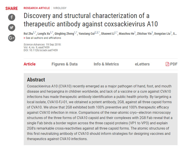 9月20日,《科学》子刊《科学•进展》(Science Advances)刊出了我校夏宁邵教授团队发表的题为“Discovery and structural characterization of a therapeutic antibody against coxsackievirus A10”的研究论文。该研究首次发现手足口病重要病原体柯萨奇病毒A组10型(CVA10)不同类型病毒颗粒共有的优势中和表位,揭示了病毒颗粒及其与优势中和抗体复合物的精确三维结构,阐明了中和抗体的功能与作用机制,为新型疫苗和治疗药物的研制提供了重要的理论基础。这是夏宁邵教授团队继2017年在《自然•通讯》(Nature Communications)上发表手足口病重要病原体CVA6病毒颗粒结构及其优势中和表位的研究论文之后的又一重要研究成果。