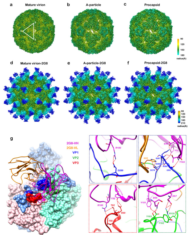 该研究首次揭示并描绘了CVA10的病毒颗粒及其优势中和表位的精确特征,发现了具有良好应用潜能的治疗性中和抗体,为新型疫苗和特异性治疗药物的研究提供了关键基础。该研究发现CVA10具有三种颗粒类型,分别为成熟颗粒(Mature virion)、脱衣壳中间态(A-particle)和前体病毒衣壳(Procapsid),并应用冷冻电镜技术首次成功解析了三种颗粒的近原子分辨率结构。这三种病毒颗粒均具有良好的免疫原性和免疫保护性,其中Mature virion的免疫性能相对更优。同时,获得了一株在体内外感染模型中具有良好抗病毒能力的优势单克隆中和抗体2G8,发现该抗体与CVA10的上述全部三种类型病毒颗粒均可稳定结合,可通过阻断CVA10病毒与宿主细胞相互作用从而阻止病毒感染。这是首次在肠道病毒中发现的可同时与不同类型病毒颗粒稳定结合的优势单克隆中和抗体。进一步研究发现,2G8结合表位靠近病毒颗粒上具有核酸外输通道作用的类三倍轴孔洞,是肠道病毒中首次发现位于该区域的优势中和表位,可作为新型疫苗和药物的良好靶标。这些发现进一步丰富了小RNA病毒的结构信息和病毒学理论,也为发展针对CVA10的新型疫苗和治疗药物提供了关键基础。