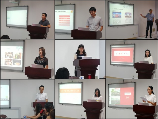 9名辅导员依次上台,使用PPT向与会人员汇报过去一个学年的工作内容。主要侧重在三个方面:一是所带学生及分管工作情况;二是工作中的亮点与成效;三是对未来辅导员工作的思考和建议。辅导员们的汇报数据详实、内容丰富;汇报方式各具特色:有的热情洋溢,有的幽默风趣,有的温馨感人……现场听众不时发出欢快的笑声和热烈的掌声。